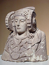 La Dama de Elche, obra maestra del arte ibero. La datación más antigua de un hecho histórico en España es la de la legendaria fundación de la colonia fenicia de Gadir (la Gades romana, que hoy es Cádiz), que según fuentes romanas (Veleyo Patérculo y Tito Livio) se habría producido ochenta años después de la guerra de Troya, antes que la de la propia Roma,45 lo que la situaría en el 1104 a. C. y sería la fundación de una ciudad en Europa Occidental de referencias más antiguas.31 32 Las no menos legendarias referencias que recoge Herodoto de contactos griegos con el reino tartésico de Argantonio se situarían, por su parte, en el año 630 a. C. Las evidencias arqueológicas de establecimientos fenicios (Ebusus —Ibiza—, Sexi —Almuñécar—, Malaka —Málaga—) permiten hablar de un monopolio fenicio de las rutas comerciales en torno al Estrecho de Gibraltar (incluyendo las del Atlántico, como la ruta del estaño), que limitó la colonización griega al norte mediterráneo (Emporion, la actual Ampurias). Las colonias fenicias pasaron a ser controladas por Cartago desde el siglo VI a. C., periodo en el que también se produce la desaparición de Tartessos. Ya en el siglo III a. C., la victoria de Roma en la Primera Guerra Púnica estimuló aún más el interés cartaginés por la península ibérica, por lo que se produjo una verdadera colonización territorial o imperio cartaginés en Hispania, con centro en Qart Hadasht (Cartagena), liderada por la familia Barca.