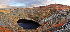 Corta Atalaya en las Minas de Riotinto, Huelva. La minería española desde 1996 ha estado marcada por la reducción progresiva y obligada en la extracción de carbones, un cierto estancamiento en la minería metálica y el crecimiento constante de los minerales y rocas industriales (celestina, sulfato sódico, sepiolita, fluorita, yeso, feldespato, pizarra, mármol, granito…) cada vez con mayor peso en el sector minero. En 2003 la producción minera anual (en toneladas) englobaba unos 20,6 millones de carbón y lignito, 265 000 de mineral de hierro, 70 000 de concentrados de cinc, 2000 de plomo, 6,5 millones de yeso, y 2 409 554 barriles de petróleo crudo al año.