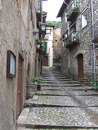 Calle Mayor de Sossís; en primer término, la Casa de la villa El 1553 tenía sólo 4 fuegos (unos 20 habitantes), y el 1718 , cuando pertenecía a los marqueses de Pallars y duques de Cardona, ya tenía 10 casas y 32 habitantes.
