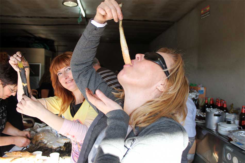 Calçot es una voz del idioma catalán con la que se denomina a un cultivo de la Allium cepa o cebolla. Es típico de la zona interior de Cataluña (España), pero especialmente de toda la zona occidental, correspondiente a las tierras del Ebro y la comarca del Alto Campo. Es uno de los platos típicos de la gastronomía catalana, muy consumido a finales de Invierno con salsa romesco, completando con un segundo plato compuesto por carnes y butifarras típicas. El Calçot de Valls, protegido por una denominación de origen, se caracteriza por una longitud de 15 a 25 cm (parte blanca) y un diámetro, medido a 5 cm de la raíz, de entre 1,7 y 2,5 cm. "Calçot" viene del hecho de que en su cultivo se amontona tierra sobre los brotes que crecen de la cebolla inicial ("calçar la terra sobre la planta"). Esto se hace para conseguir un tallo blanco de unos 20 a 25 cm. Origen El origen de los calçots es objeto de debate: una de las versiones más comúnmente aceptadas afirma que se debe su descubrimiento a Xat de Banigues, un campesino de finales del siglo XIX de la zona de Valls (Provincia de Tarragona), que por descuido, preparó a la brasa unas "cebollas" que sobrecalentó. Se quemaron todos por la parte exterior y, en lugar de tirarlos, peló las capas más externas quemadas, descubriendo que su interior estaba muy tierno y sabroso. Consumo Una teja de calçots junto a dos platos con salsa romesco. Se consumen los tallos jóvenes y se puede hacer entre el final del invierno y principios de la primavera europea. El calçot forma la base de las populares calçotades que se celebran en Cataluña, que se han convertido en una fiesta en la que se consumen asados preferiblemente con "redoltes de ceps" y tienen que hacerse sobre la llama viva, no hay que esperar a que se haga brasa que es como se asaría la carne. Una vez hechos cuando las capas exteriores están negras, entreabiertas y echan una especie de espumita, se envuelven en grupos de 25 aproximadamente en varias hojas de papel de periódico y se dejan como mínimo una media hora para que acaben de cocerse con su propio calor. Se comen pelando las capas exteriores y untando el calçot acompañados de una salsa denominada salvitxada o también con salsa de romesco. Una vez consumidos los calçots y tras lavarse las manos ( quedan completamente negras), se come carne y butifarras asadas sobre las brasas que quedan después de hacer los calçots, todo ello regado con vino o con cava. [editar]Propiedades nutritivas Sus propiedades nutritivas son iguales a las de la cebolla, es decir, tiene un amplio contenido de vitaminas y minerales. Además, se le atribuyen propiedades diuréticas, tonificantes, digestivas y afrodisíacas. Se ha comprobado que contienen algunos agentes anticancerígenos. Cultivo Se obtienen los bulbos a partir de la siembra de semillas. Las semillas se plantan a finales de invierno, se trasplantan los cebollinos en primavera y se recogen los bulbos en verano. A mediados de septiembre se pueden plantar los bulbos en tierra y según crecen se van calzando, es decir, cubriendo con tierra para que queden blancos. El cultivo del calçot es habitual en las comarcas de Tarragona próximas al mar y con inviernos suaves. Aunque también se cultiva en el interior, en zonas que no tengan fuertes heladas, estos se recogen un poco más tarde que los calçots del litoral. Reino: Plantae División: Magnoliophyta Clase: Liliopsida Orden: Asparagales Familia: Alliaceae Género: Allium Especie: A. cepa Nombre binomial Allium cepa L. La calçotada es una comida típica de la región occidental de Cataluña; originaria de Valls, en la comarca del Alt Camp, en las últimas décadas se ha extendido y puede degustarse en casi cualquier parte de la comunidad durante el final del invierno y comienzos de la primavera; los calçots, una variedad de cebolletas especialmente cultivada para este propósito, se asan directamente sobre llamas de sarmientos y se comen con la mano, aderezados con una salsa especial, la salvitxada, similar a la romesco. Mientras tanto, las brasas se aprovechan para asar carnes o embutidos para el segundo plato. s se calcina, dejando el interior tierno y cremoso. Tradicionalmente se llevan a la mesa sobre una teja de barro o se empaquetan con papel de periódico, que ayudan a conservarlos calientes. El procedimiento de ingesta — arrancando la capa carbonizada con las manos — hace inevitable mancharse, por lo que es tradicional ponerse un enorme babero que llega del cuello hasta las rodillas. Las fechas típicas para degustar esta especie de cebolla dulce es durante los meses de invierno y primavera. Es costumbre acompañarlos con un buen cava catalán (para los calçots) y con los excelentes vinos de la zona (con el segundo plato, para el que algunos puristas dicen preferir la "botifarra amb mongetes"). Wikipedia |