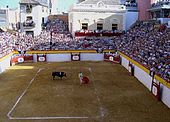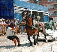 Fiesta dels enfarinats de Ibi. La Comunidad Valenciana cuenta con una gran cantidad de fiestas en todos sus municipios, aunque se pueden destacar las siguientes: Durante todo el año casi seguidas unas de otras, se celebran las fiestas de Moros y Cristianos de Alcoy, Onteniente, en el Valle de Albaida, en la Villajoyosa (el desembarc), en el Condado de Cocentaina, en las comarcas del Vinalopó y de la Huerta Sur, etc. También son populares las fiestas de bous al carrer, en las que el toro es el protagonista, sobre todo en las comarcas del interior, siendo las más conocidas el torico de la cuerda en Chiva, las fiestas de Segorbe, o los bous a la mar en Denia. Estas fiestas se centran en la suelta de toros y vaquillas por un recinto acotado con barreras, que comprende las calles más céntricas del pueblo o ciudad. Las reses son toreadas por los mozos, que efectúan recortes, quiebros, etc.. Es también característico el toro embolado, que consiste en colocar unas bolas de estopa encendida mediante el empleo de unos hierros llamados aparatos, que se colocan en las astas del animal. Estas fiestas taurinas atraen gran cantidad de gente de las poblaciones cercanas y su ambiente es de gran bullicio. A finales de febrero o principio de marzo (sobre el tercer Domingo de Cuaresma), se celebran las Fiestas de la Magdalena, de Castellón de la Plana. También durante la primera semana de febrero se celebra en Orihuela el Mercado medieval, el cual es el más grande de Europa. Ocupa el espacio del casco antiguo de la ciudad, declarado conjunto histórico-artístico y monumental. Del 15 al 19 de marzo se celebran las Fallas en honor a San José, las cuales son las fiestas grandes de la ciudad de Valencia, aunque también se celebran en otras localidades de la Comunitat, siendo las fiestas más celebradas, junto a los moros y cristianos, en la comunidad autónoma. En primavera se celebra la Semana Santa en el conjunto de la comunidad, aunque destacan las celebraciones que se desarrollan en Orihuela, Alicante, Elche, los poblados marítimos de Valencia, Gandia, Alzira, Xàtiva, Sagunt, Benetússer,Crevillent etc., las cuales se han declaradas Fiestas de Interés Turístico Internacional, Nacional, Autonómico o Provincial, según el caso. En abril se celebran en diversos pueblos y ciudades las fiestas en honor a San Vicente Ferrer, patrón de la Comunidad. En junio se celebran las Hogueras de San Juan, destacando las que se plantan en Alicante del 20 al 24 de junio. El 14 de agosto se celebra el Misterio de Elche, durante el día de la Asunción de la Virgen. El último miércoles de agosto se celebra otra de las fiestas más internacionales de la Comunidad, la popular Tomatina de Buñol. Y también a finales de agosto durante las fiestas patronales de Paterna se realiza la Cordá. La Fiesta de la Vendimia de Requena y Utiel a finales de agosto o principios de septiembre. A principios de septiembre destacan las Fiestas de Nuestra Señora de la Salud de Algemesí, con la los tradicionales bailes, como Muixeranga, los torneadores, o el Bolero. Y a finales de septiembre, también en Algemesí se celebra la la Semana Taurina, con la particular plaza de toros de madera. En octubre son la Feria y Fiestas de Gandía, tradicionalmente anuncia su comienzo el tío de la porra. Se puede disfrutar allí de un mercado renacentista, representaciones de la familia Borgia, disfrutar de la gastronomía en la plaza "del mosset", actuaciones artísticas a pie de calle en todo el centro histórico y de las atracciones en el recinto ferial. Cada 9 de octubre, día de la Comunidad Valenciana y de San Dionisio, se celebra, en la Ciudad de Valencia y alrededores, la mocadorà y los Moros y Cristianos de Crevillent con motivo de las fiestas patronales en honor a San Francisco de Asís. En noviembre destaca la Feria de Todos los Santos de Cocentaina, la cual es de una de las ferias más importantes de la Comunidad Valenciana cuyo origen se remonta al año 1346. Y todos los 28 diciembre, se celebra la fiesta dels enfarinats, en la localidad de alicantina de Ibi, en la que se realiza una batalla de harina, huevos y cohetes borrachos. Una característica, presente en la práctica mayoría de las celebraciones en todos los rincones de la Comunidad es el uso extensivo de la pólvora, utilizada tanto en las fiestas oficiales (mascletá, trabucos de los moros y cristianos, cordá y tracas.) como en los eventos de todo tipo: bautizos, bodas, comuniones, carreras motociclistas, etc. Indumentaria tradicional[editar]
