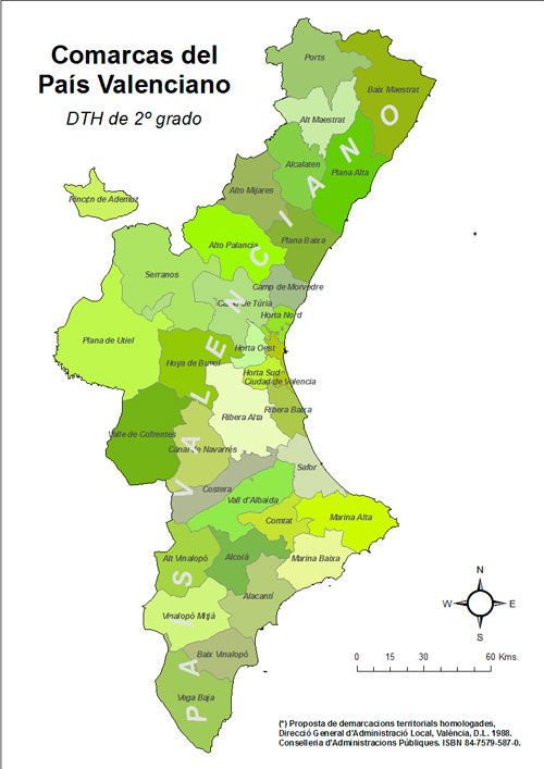 Provincias[editar] Artículo principal: Provincias de la Comunidad Valenciana. Las provincias constituyen la división administrativa más antigua aún vigente en la Comunidad Valenciana, ya que fueron creadas por Javier de Burgos mediante el Real Decreto de 30 de noviembre de 1833, partiendo de la agrupación de municipios, y tomando el nombre de sus capitales. La Comunidad Valenciana surgió mediante la unión formal de tres provincias. Mapa Provincia Población Superficie (km²) Municipios Partidos Judiciales Alicante 1.934.127 5.816 141 13 Castellón 604.344 6.632 135 5 Valencia 2.578.719 10.763 266 19 Comarcas[editar] Artículos principales: Comarcas de la Comunidad Valenciana e Historia de las comarcas valencianas. La estructuración comarcal está prevista en el Estaturo de autonomía, pero no se ha aprobado una ley de demarcación comarcal. Existe un informe que contiene una propuesta denominada "Propuesta de demarcaciones territoriales homologadas", publicada en un libro por la Consejería de Administraciones Públicas en 1987, en el que se proponían tres categorías de demarcaciones territoriales homologadas (DTH). Así, la primera categoría de DTH sería el municipio; la segunda, la comarca; y la tercera, la provincia. En esta propuesta no se daba ninguna definición de comarca, ni tampoco se otorgaba competencias ni entidad jurídica de nivel comarcal. Aunque el comarcalismo ha sido una forma de estructura tradicional de la Comunidad Valenciana, la división comarcal de dicha propuesta es moderna, fruto de un intenso y también conflictivo debate que comenzó en los años 1960. De este modo, la Comunidad Valenciana se divide en las 35 comarcas siguientes: Comarcas de la Comunidad Valenciana Alicante Castellón Valencia El Alto Vinalopó (Alt Vinalopó) El Alcalatén El Campo de Morvedre (Camp de Morvedre) El Bajo Vinalopó (Baix Vinalopó) El Alto Maestrazgo (Alt Maestrat) El Campo de Turia (Camp de Túria) El Campo de Alicante (Alacantí) El Alto Mijares La Canal de Navarrés El Condado de Cocentaina (Comtat) El Alto Palancia La Costera La Hoya de Alcoy (L'Alcoià) El Bajo Maestrazgo (Baix Maestrat) La Huerta Norte (Horta Nord) La Marina Alta La Plana Alta La Huerta Oeste (Horta Oest) La Marina Baja (Marina Baixa) La Plana Baja (Plana Baixa) La Huerta Sur (Horta Sud) La Vega Baja del Segura Los Puertos de Morella (Els Ports) La Hoya de Buñol El Medio Vinalopó (Vinalopó Mitjà) - La Plana de Utiel-Requena - - La Ribera Alta - - La Ribera Baja (Ribera Baixa) - - El Rincón de Ademuz - - La Safor - - Los Serranos - - Valencia (València) - - El Valle de Albaida (Vall d'Albaida) - - El Valle de Ayora Municipios[editar] Artículo principal: Anexo:Municipios de la Comunidad Valenciana. Los municipios son entidades con personalidad jurídica plena, y son la base territorial de la Comunidad Valenciana donde se cuentan 542, de los cuales 135 son de la Provincia de Castellón, 266 de Valencia y 141 de Alicante. Según los datos del INE de 2012 la población que representaban en conjunto era de 5.129.266 habitantes. Los municipios gozan de autonomía en la gestión de sus intereses, su gobierno y administración corresponde a los ayuntamientos. Los ayuntamientos pueden crear mancomunidades para la prestación o gestión más eficiente de servicios propios municipales. Los mayores municipios (2012) >30.000 hab.34 Posición Municipio Población Posición Municipio Población 1ª Valencia 797.028 17ª Denia 44.455 2ª Alicante 334.678 18ª Mislata 43.800 3ª Elche 230.587 19ª Burjasot 38.175 4ª Castellón de la Plana 180.204 20ª Onteniente 37.140 5ª Torrevieja 103.720 21ª Burriana 35.598 6ª Orihuela 90.087 22ª Villena 34.894 7ª Torrente 81.402 23ª Petrel 34.697 8ª Gandía 79.010 24ª Santa Pola 33.965 9ª Benidorm 72.991 25ª Villajoyosa 33.293 10ª Paterna 67.356 26ª Jávea 32.983 11ª Sagunto 65.238 27ª Vall de Uxó 32.782 12ª Alcoy 60.837 28ª Manises 31.066 13ª San Vicente del Raspeig 55.100 29ª Aldaya 30.874 14ª Elda 54.536 30ª Chirivella 30.213 15ª Villarreal 51.357 31ª Alacuás 30.202 16ª Alcira 44.941