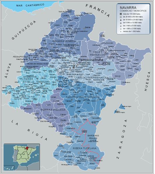 Densidad de población de los municipio de Navarra en el año 2006. Distribución de la población[editar] Más del 50% de la población de Navarra se concentra en torno al área metropolitana de Pamplona. De los 272 municipios de Navarra 158 tienen menos de 500 habitantes, 33 entre 500 y 1000, 72 entre 1.000 y 10.000 y 10 más de 10.000. Los 10 municipios más poblados de Navarra son: Municipio Población 2012 Pamplona 197 604 Tudela 35 358 Barañáin 21 444 Burlada 18 162 Egüés 17 450 Estella 14 138 Zizur Mayor 14 084 Tafalla 11 256 Ansoáin 10 938 Villava 10 496 Migración[editar] Movimientos migratorios[editar] Entre 1900 y 1950: En Navarra la emigración era superior a la imigración, sobre todo en la áreas rurales del norte de la comunidad. Los principales países de destino de los emigrantes navarros fueron Argentina, Venezuela, Chile y México, hasta 1950. A partir de 1950, comenzaron a dirigirse a países de Europa occidental como Francia, Bélgica, Suiza o Alemania. En la década de 1960: Navarra pasó a ser una región receptora de inmigrantes que llegaban de otras regiones españolas, especialmente del País Vasco, Andalucía, Castilla y León, La Rioja y Extremadura, atraídos por los nuevos puestos de trabajo que se crearon con la industrialización. Entre 1980 y 1999: La crisis económica frenó la llegada de trabajadores de otras Comunidades Autónomas a Navarra, pero esta empezó a recibir inmigrantes procedentes de otros países, desde finales de los años 90 llegaron a Navarra, argelinos, bolivianos, peruanos, ecuatorianos, argentinos, dominicanos y en menor proporción, de otros lugares de Asia, América del norte, África y Europa. Desde el año 2000: La llegada de emigrantes procedentes de la Europa del Este como Rusia, Rumania, Bulgaria y Polonia, aumenta de forma considerable.19 Organización territorial[editar]