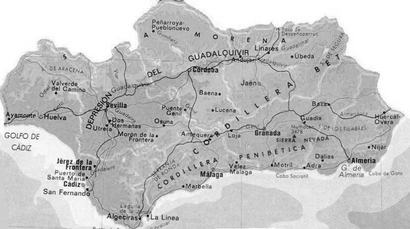 Puerto de la Ragua en Sierra Nevada. El relieve es uno de los principales factores que configura el medio natural. Las alineaciones montañosas y su disposición tienen especial incidencia en la configuración del clima, la red fluvial, los suelos y su erosión, los pisos bioclimáticos e incluso va a tener influencia en la forma de aprovechamiento de los recursos naturales.25 El relieve andaluz se caracteriza por el fuerte contraste altitudinal y en la pendiente. Entre sus fronteras se dan las mayores cotas de la Península Ibérica y casi un 15% del territorio por encima de 1.000 m; frente a las zonas deprimidas, con menos de 100 msnm de altitud en la gran Depresión Bética. En las pendientes, se produce el mismo fenómeno. En cuanto a las costas andaluzas, el litoral atlántico se caracteriza por un predominio abrumador de playas y costas bajas; por su parte el litoral mediterráneo tiene una presencia muy importante de acantilados sobre todo en la Axarquía malagueña, Granada y Almería.26 El carácter disimétrico es tal que va a configurar una división natural entre la Alta y la Baja Andalucía siguiendo las principales unidades del relieve:27 Sierra Morena, (con el pico Bañuela de 1.323m) al mismo tiempo que marca una ruptura entre Andalucía y la Meseta, presenta una gran separación -acrecentada por su despoblamiento- entre la Sierra y la Campiña de Huelva, Sevilla, Córdoba y Jaén. Sin embargo, su elevación es escasa y sólo Sierra Madrona logra superar los 1.300 msnm en su punto más alto la Bañuela (fuera de Andalucía). Dentro de este sistema montañoso cabe destacar el desfiladero de Despeñaperros, que constituye la frontera natural con Castilla. Las Cordilleras Béticas (Penibética y Subbética) se desarrollan paralelas al Mediterráneo y no están alineadas, dejando entre ellas el Surco Intrabético. El Subbético es muy discontinuo, por lo que presenta numerosos pasillos que facilitan la comunicación. Por el contrario, el Penibético ejerce de barrera aisladora entre el litoral mediterráneo y el interior.28 Las mayores alturas de Andalucía se encuentran en Sierra Nevada, en la Provincia de Granada; allí se sitúan las cotas más elevadas de la Península Ibérica: el pico Mulhacén (3.478 m) y el Veleta (3.392 m). La Depresión Bética se encuentra entre ambos sistemas. Es un territorio llano casi en su totalidad, abierto hacia el Golfo de Cádiz por el suroeste. A lo largo de la historia, éste ha sido el principal eje de población de Andalucía. Hidrografía[editar] Ríos y cuencas de Andalucía.
