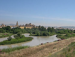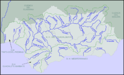El Guadalquivir a su paso por Córdoba. Artículo principal: Hidrografía de Andalucía. Véase también: Agencia Andaluza del Agua. Por Andalucía discurren ríos de la vertiente atlántica y de la mediterránea. A la vertiente atlántica pertenecen los ríos Guadiana, Odiel-Tinto, Guadalquivir, Guadalete y Barbate; mientras que a la vertiente mediterránea corresponden el Guadiaro, Guadalhorce, Guadalmedina, Guadalfeo, Andarax (o río Almería) y Almanzora. Entre ellos, el Guadalquivir destaca por ser el río más largo de Andalucía y el quinto de la Península Ibérica (657 km).29 Los ríos de la cuenca atlántica se caracterizan por ser extensos, discurrir en su mayor parte por terrenos llanos y regar extensos valles. Este carácter determina los estuarios y las marismas que se forman en sus desembocaduras, como las marismas de Doñana formadas por el río Guadalquivir, y las marismas del Odiel. Los ríos de la cuenca mediterránea son más cortos, más estacionales y con más pendiente media, lo que provoca unos estuarios menos extensos y valles menos propensos a la agricultura. El efecto de sotavento que provocan los Sistemas Béticos hace que sus aportes sean reducidos.27 Los ríos andaluces se enmarcan en cinco cuencas hidrográficas distintas: la cuenca del Guadalquivir, la cuenca atlántica andaluza, que incluye las subcuencas de Guadalete-Barbate y Tinto-Odiel, y la cuenca del Guadiana, que conformarían la vertiente atlántica. En la cuenca mediterránea andaluza quedan los ríos que desembocan en el Mediterráneo. Además en Andalucía se extiende una pequeña parte de la cuenca del río Segura.30 Flora y fauna[editar]