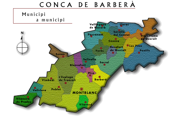 La base económica de la Conca de Barberà es la agricultura. Los principales productos son los cereales, la viña, los almendros y los avellanos. Los cereales se cultivan casi de forma exclusiva en la zona conocida como la Baja Segarra (Baixa Segarra). El principal cultivo es el del trigo, seguido por la cebada. Hay muy poca ganadería. El cultivo de la viña tuvo su gran expansión en el siglo XIX, coincidiendo con una plaga de filoxera que atacó los campos franceses. En una primera época, casi toda la producción se utilizaba para hacer aguardiente. Más adelante se incrementó la producción de vino. En 1893 la filoxera llegó a la comarca y muchos campos quedaron abandonados. Actualmente la producción de vino es destacada y cuenta con su propia denominación de origen. Muy ligada al cultivo de la uva, en la comarca empezó a desarrollarse la industria vinícola. Otra de las industrias tradicionales fueron los molinos de harina y aceite. En la década de 1960 se instalaron en el área algunas industrias dedicadas a la confección. Sin embargo, el crecimiento industrial no ha sido excesivo y se concentra principalmente en Montblanch, Santa Coloma de Queralt y Espluga de Francolí. Rutas turísticas[editar · editar código] Ruta medieval[editar · editar código] Iglesia de San Miguel (Montblanch). Es interesante el recorrido por los lugares que conservan un cierto sabor medieval, que han conservado murallas, portadas, castillos, palacios, iglesias de la Edad Media. Son los núcleos siguientes: Vimbodí Monasterio de Poblet Espluga de Francolí Montblanch Barbará Sarral Rocafort de Queralt Conesa Las Pilas Biure de Gaià Santa Coloma de Queralt Ruta de los castillos[editar · editar código] Las fortificaciones se encuentran distribuidas a lo largo de la frontera natural del río Gaià en los tiempos medievales de la Marca Hispánica. Montargull Aguiló Santa Coloma de Queralt (Uno de los mejores de la ruta, recientemente restaurado). Figuerola Sant Gallard Guialmons Las Pilas Biure de Gaià Pontils Santa Perpètua de Gaià Seguer Sant Magí de la Brufaganya Ruta de las bodegas modernistas[editar · editar código] Son bodegas construidas en la época del modernismo y que suponen un incremento artístico e histórico en el patrimonio de la comarca. en estas bodegas se han elaborado vinos de alta calidad. Rocafort de Queralt Solivella Blancafort Vimbodí Espluga de Francolí Montblanch Barbará Sarral Municipios[editar · editar código] Distribución de los municipios. Municipios Habitantes Barbará 488 Blancafort 421 Conesa 133 Espluga de Francolí 3.814 Forès 62 Las Pilas 191 Llorach 141 Montblanch 6.632 Pasanant 205 Pira (Tarragona) 478 Pontils 142 Rocafort de Queralt 264 Santa Coloma de Queralt 2.991 Sarral 1.503 Savallá del Condado 73 Senan 39 Solivella 567 Vallclara 117 Vallfogona de Riucorp 177 Vilanova de Prades 155 Vilavert 437 Vimbodí 1.054 Cuenca de Barberá Comarca de España Ubicación de Cuenca de Barberá Coordenadas: 41°22′0″N 1°9′0″ECoordenadas: 41°22′0″N 1°9′0″E (mapa) Capital Montblanch Entidad Comarca • País Bandera de España España Subdivisiones Municipios 22 Superficie Puesto 24.º • Total 650 24 km²(2,02) Población Puesto 32.º • Total 20 057 hab.(0,29) • Densidad 30,85 hab/km² Gentilicio barberano, -ana Sitio web oficial Wikipedia |