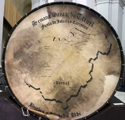 En las comarcas del Bajo Aragón, Andorra-Sierra de Arcos y Bajo Martín (todas dentro del Bajo Aragón Histórico), en España, existen nueve localidades pertenecientes a la provincia de Teruel, en las que se puede seguir en Semana Santa una ruta excepcional por el modo especial que tienen de celebrar esos días la Pasión de Cristo. Es una costumbre procedente probablemente de alguna ceremonia ancestral, aunque históricamente se dice que proviene de la Edad Media, cuando los caballeros de las Órdenes Militares trajeron a estas tierras esos dos instrumentos de percusión. La tradición consiste en empezar a tocar el bombo y el tambor (Romper la Hora) el Jueves Santo o el Viernes Santo, a una hora determinada. Este comienzo se llama «romper la hora», y se inicia en casi todos los pueblos el Jueves Santo a las 12 de la noche mientras que en Calanda es a las 12 del mediodía del Viernes Santo; también hay un toque particular y un color distinto para las túnicas de cada pueblo. El Romper la hora se inicia inmediatamente después de una señal especial que se da en la plaza del Ayuntamiento. Desde ese momento el estruendo acompasado de tambores y bombos no cesa hasta el Sábado Santo a las dos en punto de la tarde, momento en que el silencio es expectante, y para que esto sea posible, los tamboreros se van turnando. Hasta la década de 1980 sólo podían tocar el bombo o el tambor los hombres. A partir de esa fecha más o menos, las mujeres se han ido incorporando progresivamente, no quedando en este momento ningún pueblo de la ruta donde las mujeres no puedan tocar libremente. Cuando una cuadrilla de tamboreros se encuentra cara a cara en la esquina de dos calles, paran la marcha y siguen tocando cada vez con más fuerzas, como si iniciaran un "duelo a tambor" que puede durar hasta más de una hora. La Semana Santa de los pueblos que se incluyen en la Ruta del Tambor y el Bombo del Bajo Aragón fue declarada Fiesta de Interés Turístico Nacional en noviembre de 2005, a excepción de en la villa de Híjar que fue declarada como tal en el año 1980, 25 años antes que cualquier otra localidad de la ruta, ya que es esta la mas antigua en la celebración, puesto que aparece en los escritos del siglo XII encontrados en el archivo ducal y regida por la orden Pauliana, antecesora de la orden Franciscana, su dataje real es anterior en más de 200 años a la de Alcañiz y 5 siglos antes de la semana santa de Calanda dada a conocer por Buñuel en sus películas. El Tambor de Honor es un reconocimiento que el Ayuntamiento de Puebla de Híjar otorga a personalidades destacadas en el panorama político estatal y a personas que han llevado el nombre de Aragón o de la Ruta del tambor y el bombo por el mundo y de alguna u otra manera han hecho promoción de las virtudes de la región. Esta ruta comprende las siguientes nueve localidades de la provincia de Teruel y sus Cofradías: Albalate del Arzobispo [editar] Lista de cofradías Los orígenes de la Semana Santa de Albalate del Arzobispo hay que buscarla en la Orden Tercera de San Francisco que promovió el Via Crucis en el Calvario. Las primeras referencias sobre el toque del tambor en Albalate datan de 1929. Los cofrades visten hábitos de negro satinado ornados con pañuelos blancos al cuello. Albalate rompe la hora el Jueves Santo a las 12 de la noche. Cofradía de la Entrada de Jesús en Jerusalén de Albalate del Arzobispo [editar] Alcañiz Procesión del "Sellado del Sepulcro", el sábado Santo. Hermandad de El Silencio [editar] Alcorisa Pasión viviente en el "Drama de la Cruz del monte Calvario". Guardias Romanos [editar] Andorra Rompida de hora en la noche del Jueves Santo. La Semana Santa de Andorra (Teruel) se compone de las siguientes cofradías: Cofradía de la Entrada de Jesús en Jerusalén [editar] Calanda Rompida de hora al mediodía del Viernes Santo. Cofradía del Santísimo [editar] Híjar No tiene cofradias propiamente dichas ya que se organiza por cuadrillas y luego por pianas. El Romper la hora es ritual y solemne. Alabarderos [editar] La Puebla de Híjar Cofradía de Jesús Nazareno [editar] Samper de Calanda El descendimiento del Cristo de la Cama y a continuación la procesión del Santo Entierro (Viernes Santo por la tarde) son dos actos muy solemnes, así como el traslado del Santísimo al Monumento (Jueves Santo por la tarde). Paso de la Entrada de Jesús en Jerusalén [editar] Urrea de Gaén Alabarderos |